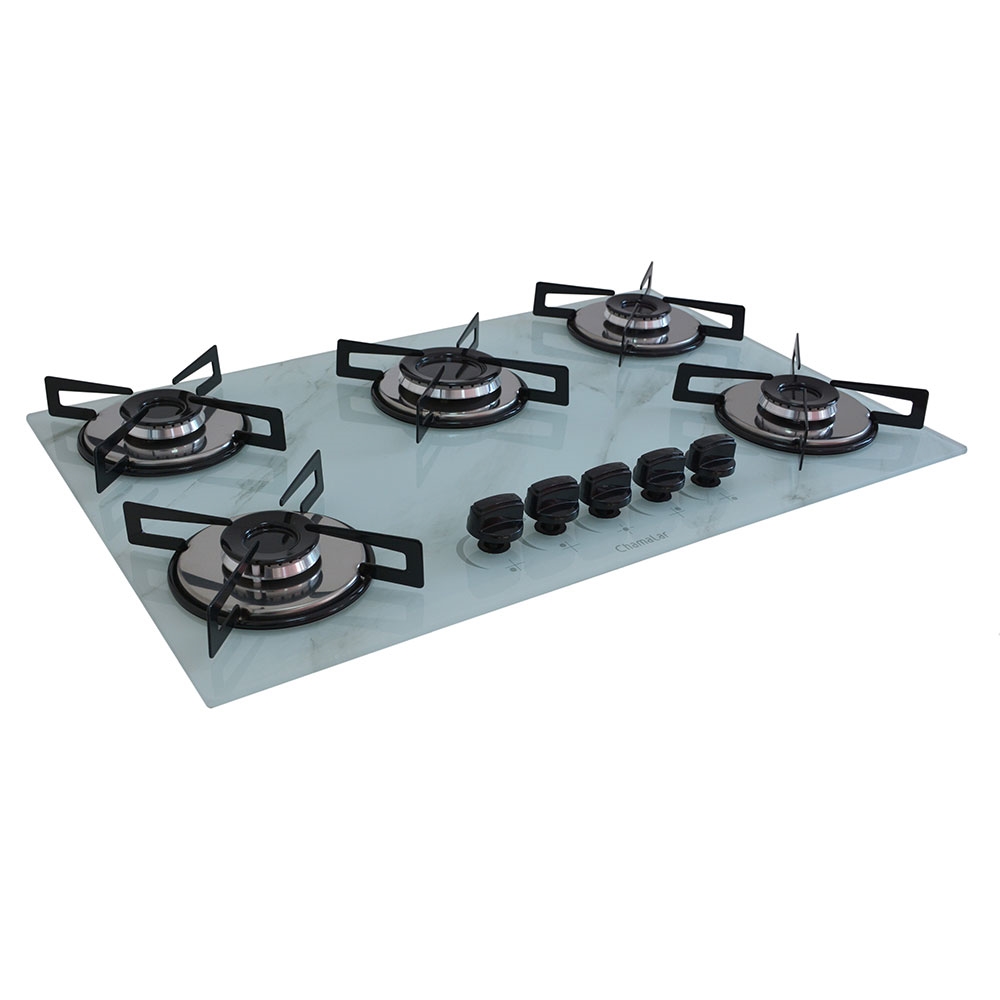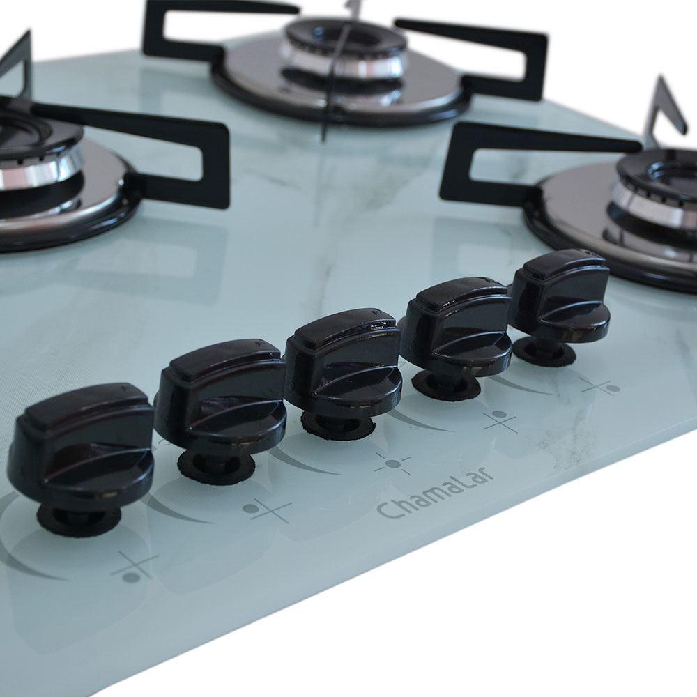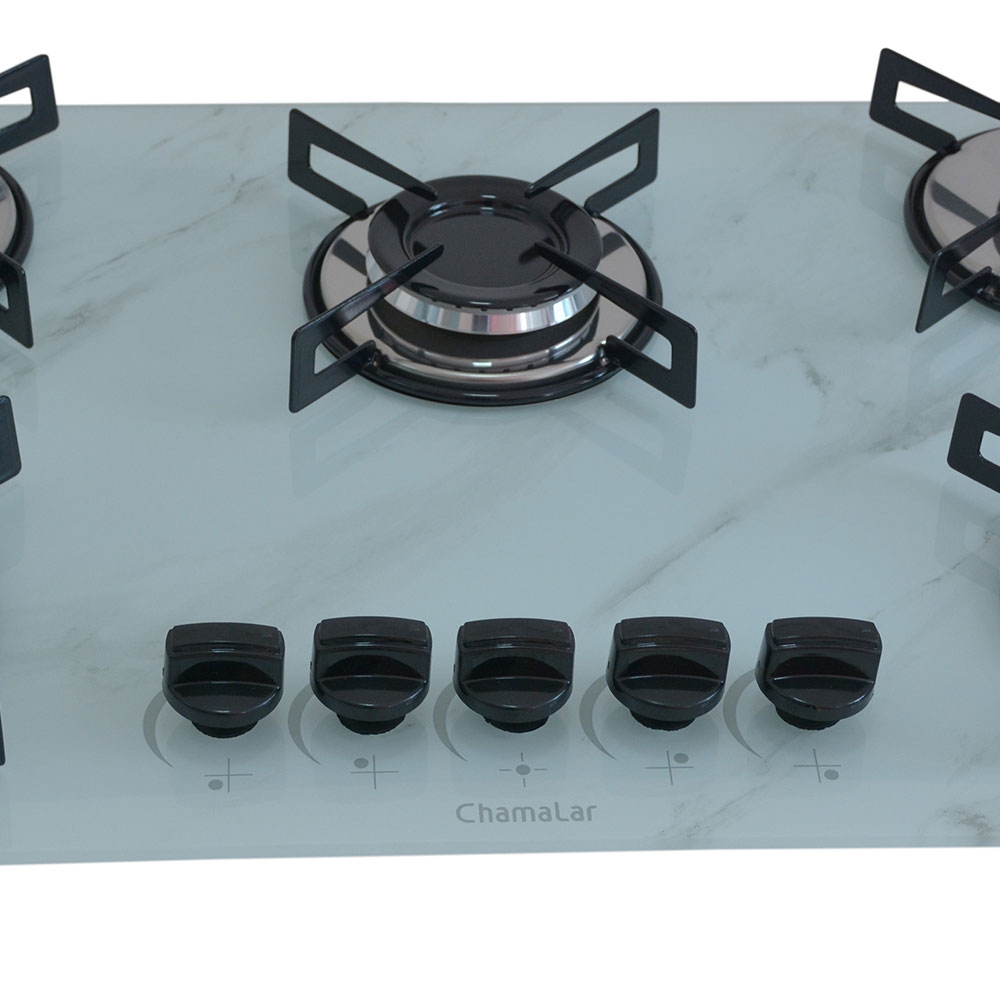 Cooktop 5 Bocas a Gás Chamalar Premium Mesa de Vidro Ultra Chama 132 Marmorizador Branco Bivolt