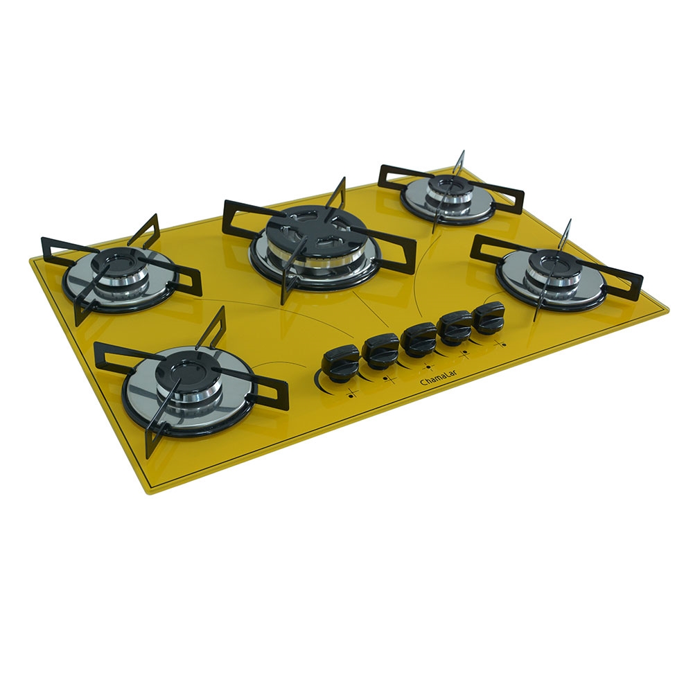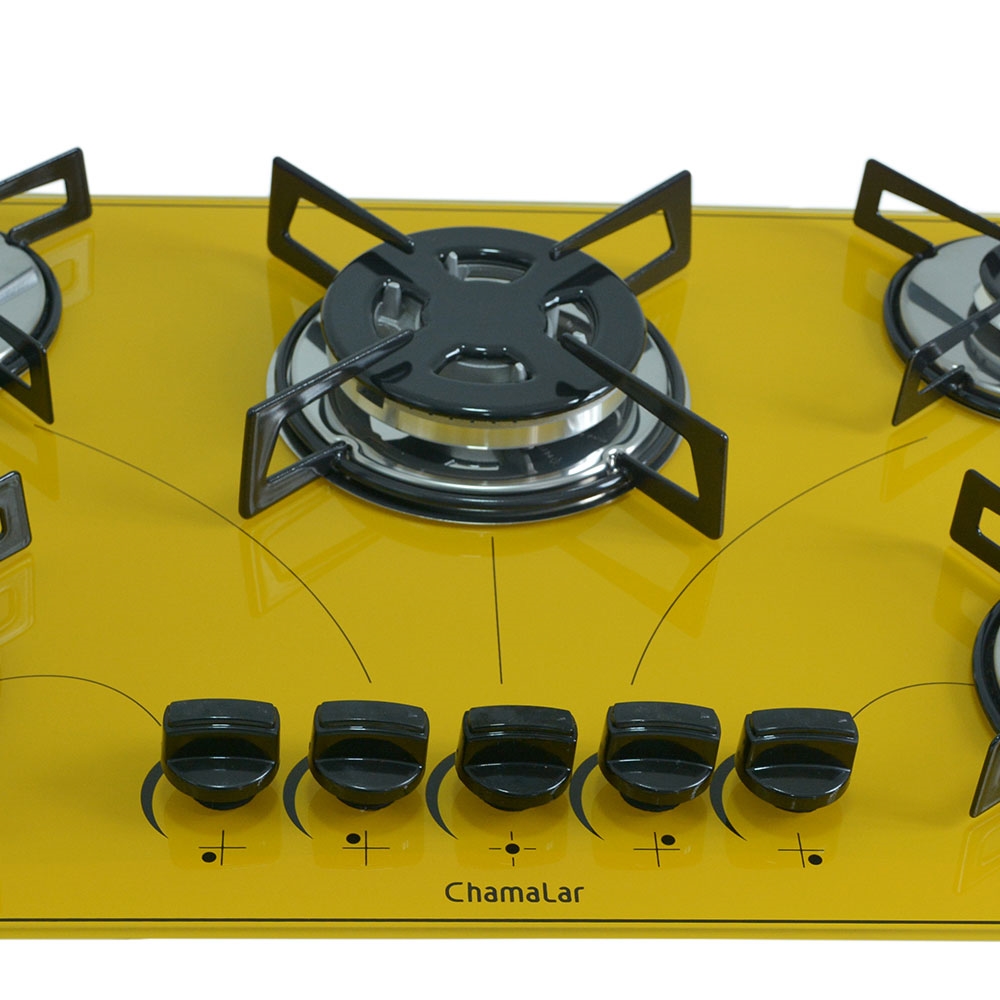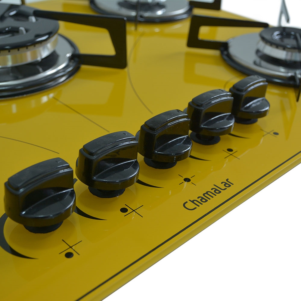 Cooktop 5 Bocas a Gás Chamalar Premium Tripla Chama Mesa de Vidro 153 Amarelo Bivolt
