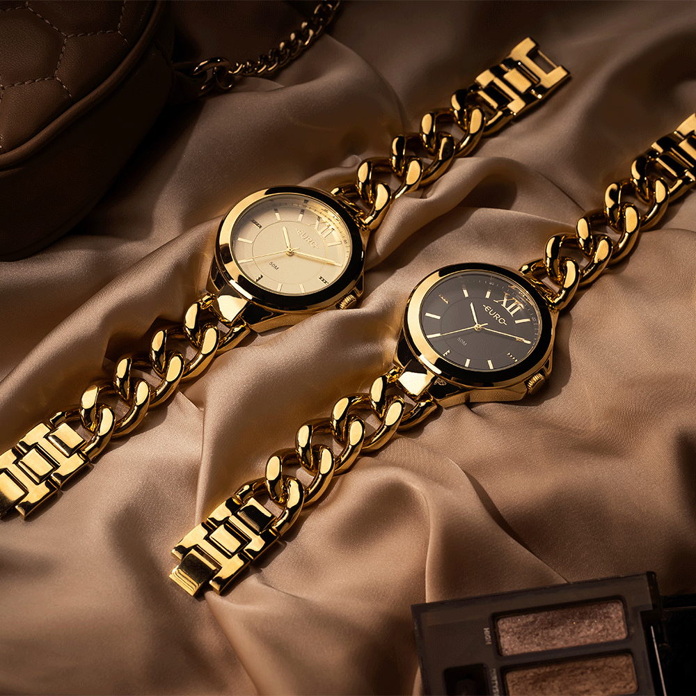A linha Chains traz a sofisticação da Joalheria ao mundo Euro. Sua pulseira em correntes douradas traz o luxo das joias para os relógios. A caixa é marcante, complementando o visual monocromático em dourado do modelo. Ideal para as mulheres que gostam de um look mais elegante e que marca presença em qualquer situação.
