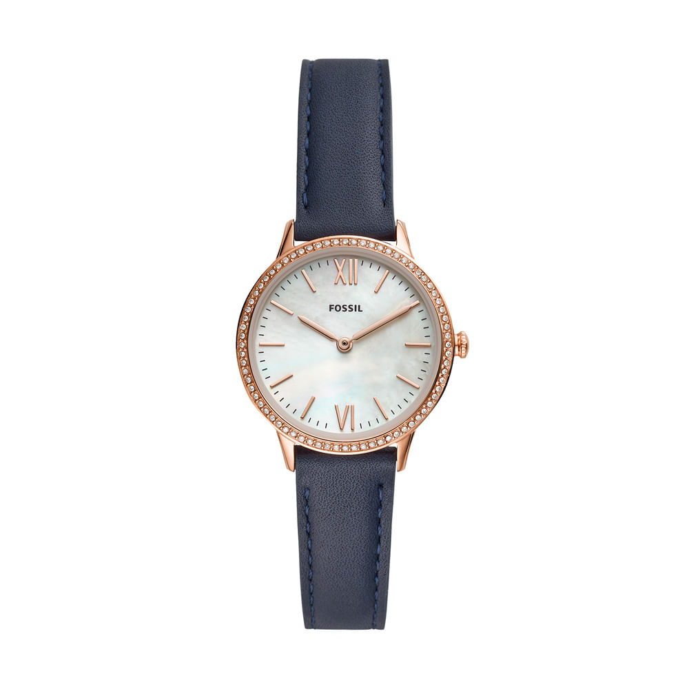 Delicado, a linha Addison lança um relógio feminino com um mostrador em madre pérola branco, com uma pulseira de couro azul e uma caixa de 30mm rosé gold redonda com cristais no aro, dando um acabamento impecável ao relógio!